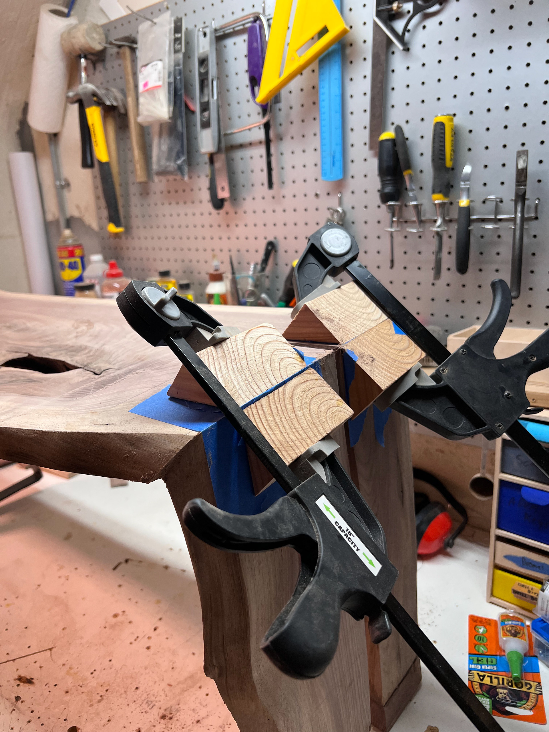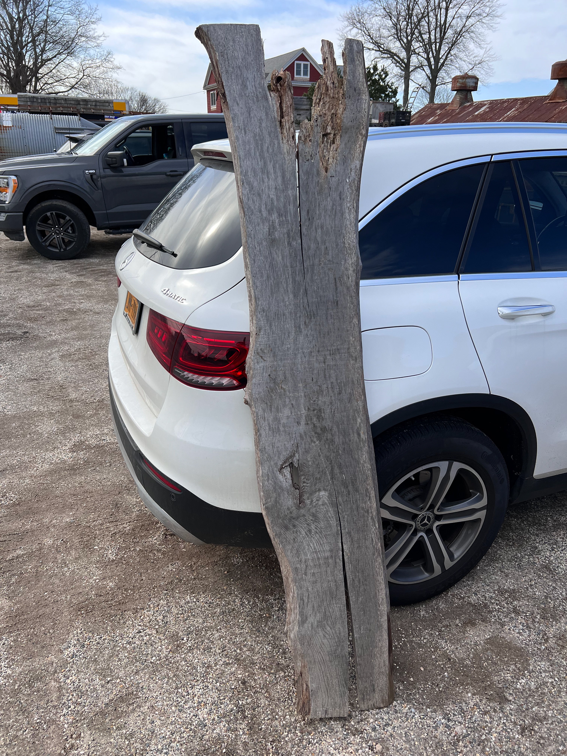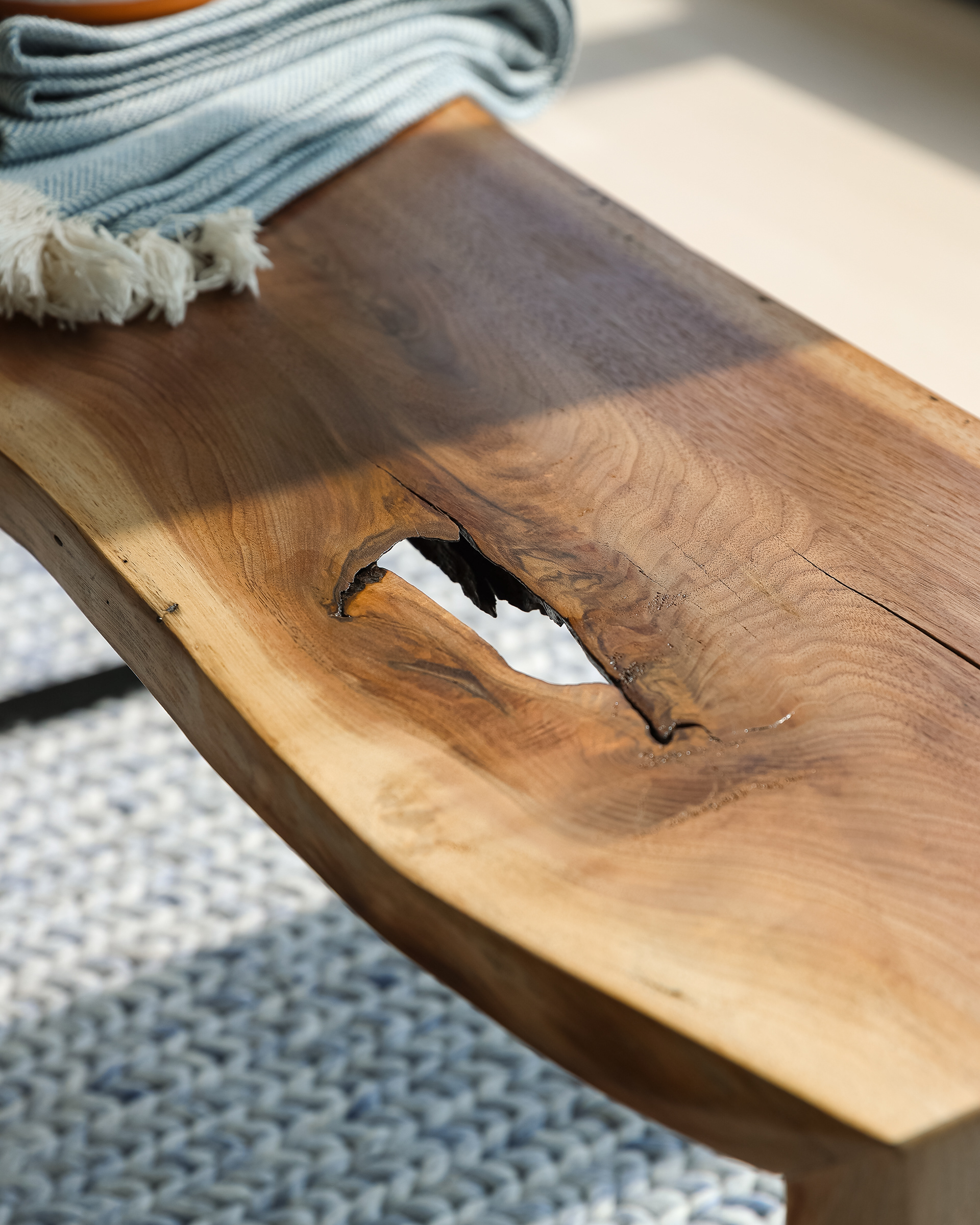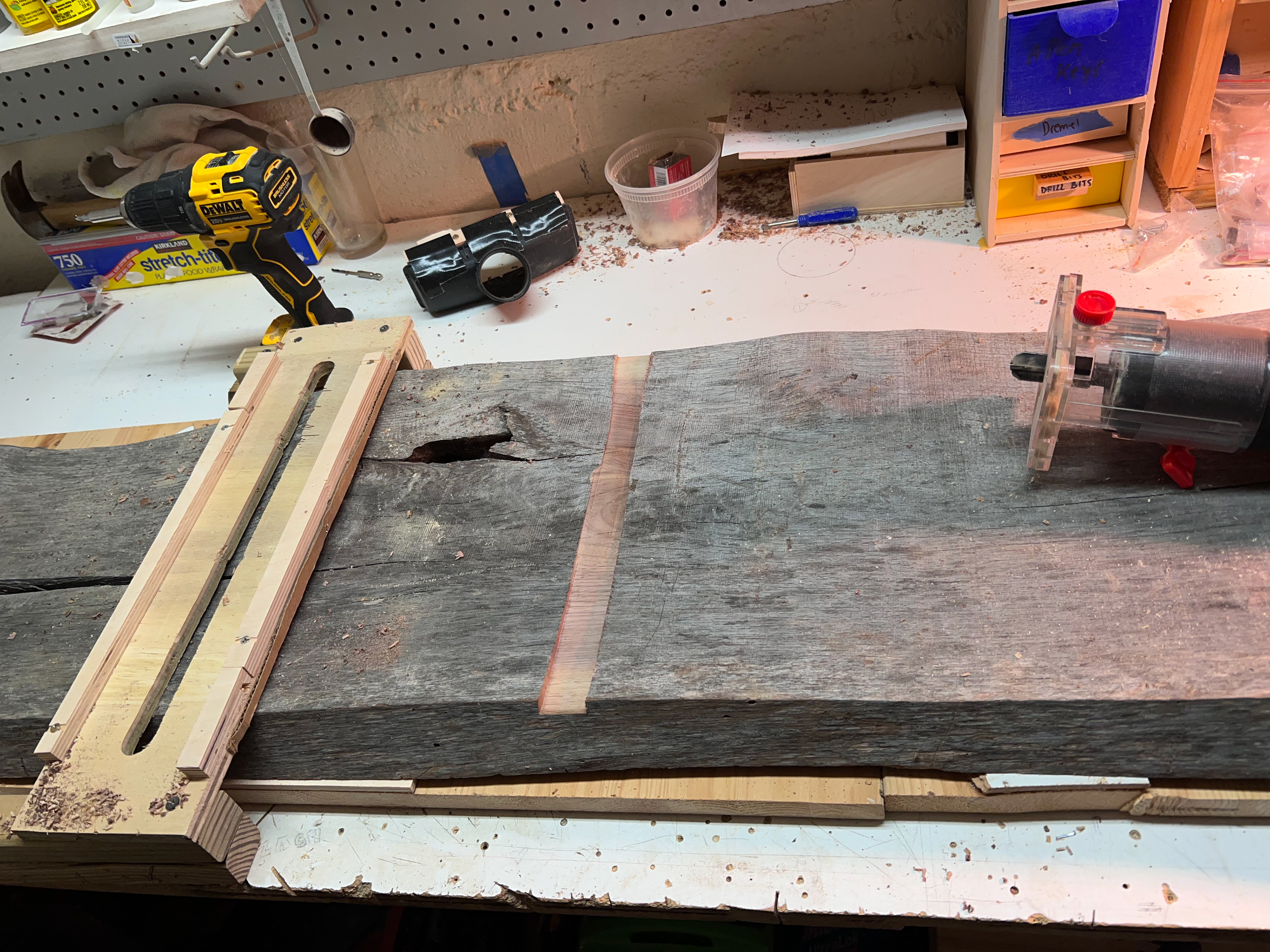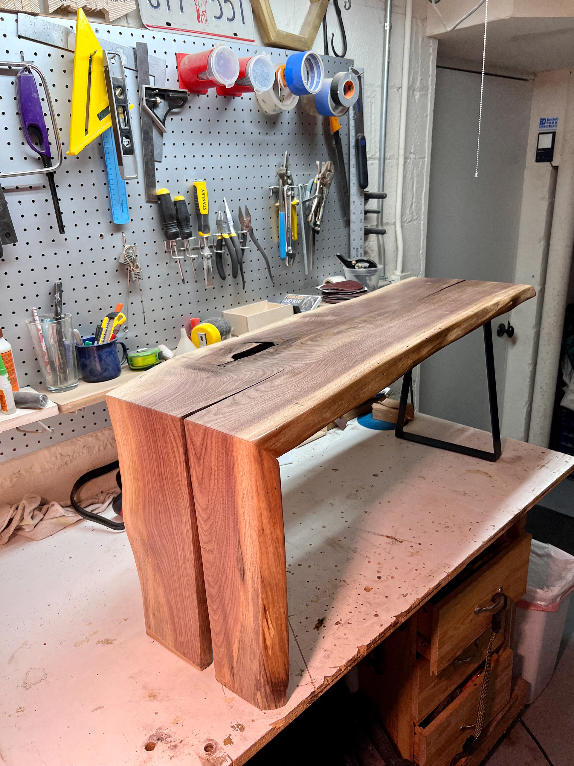 Building a bench from a reclaimed oak slab. I cleaned and flattened the slab before creating the waterfall edge.