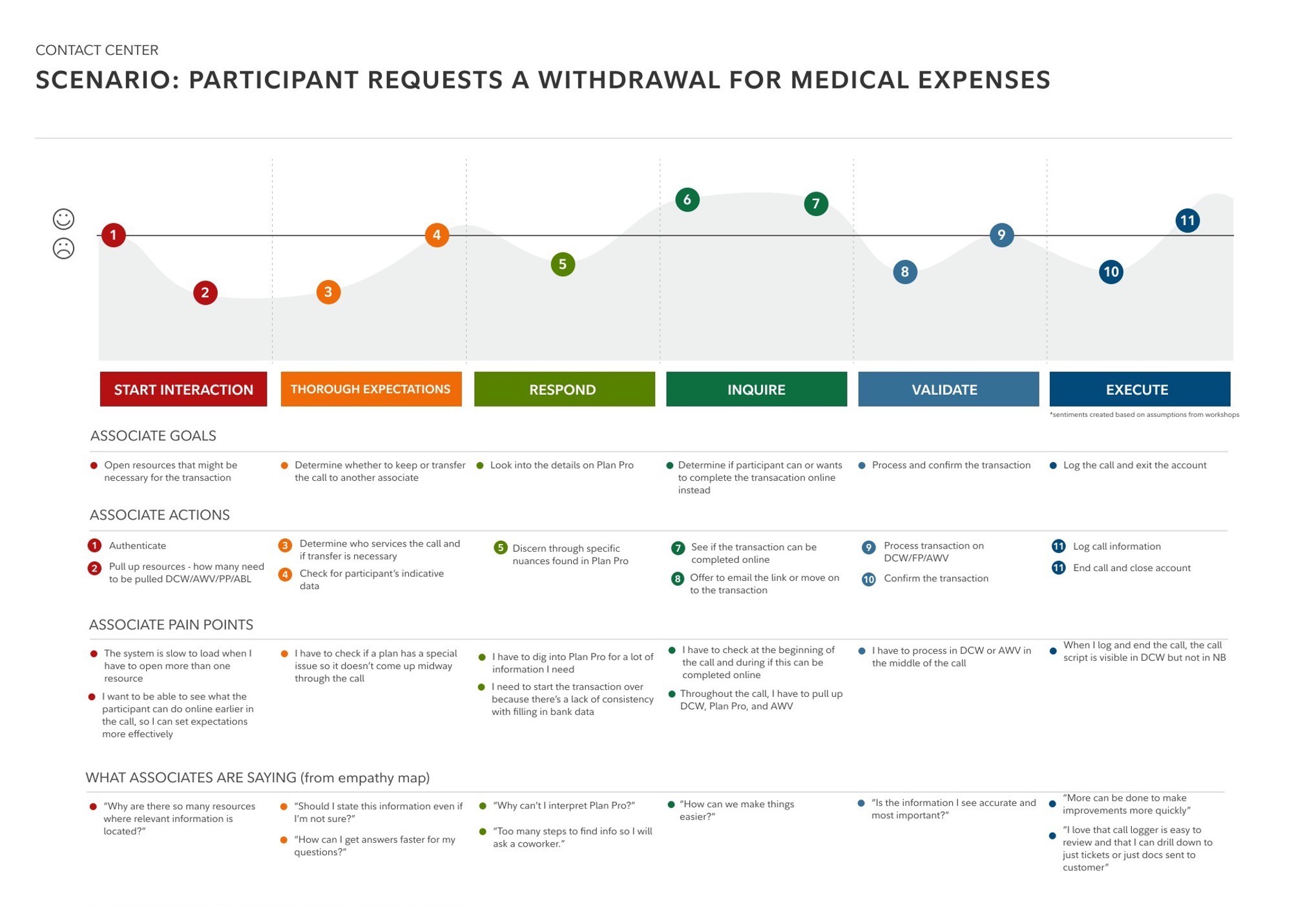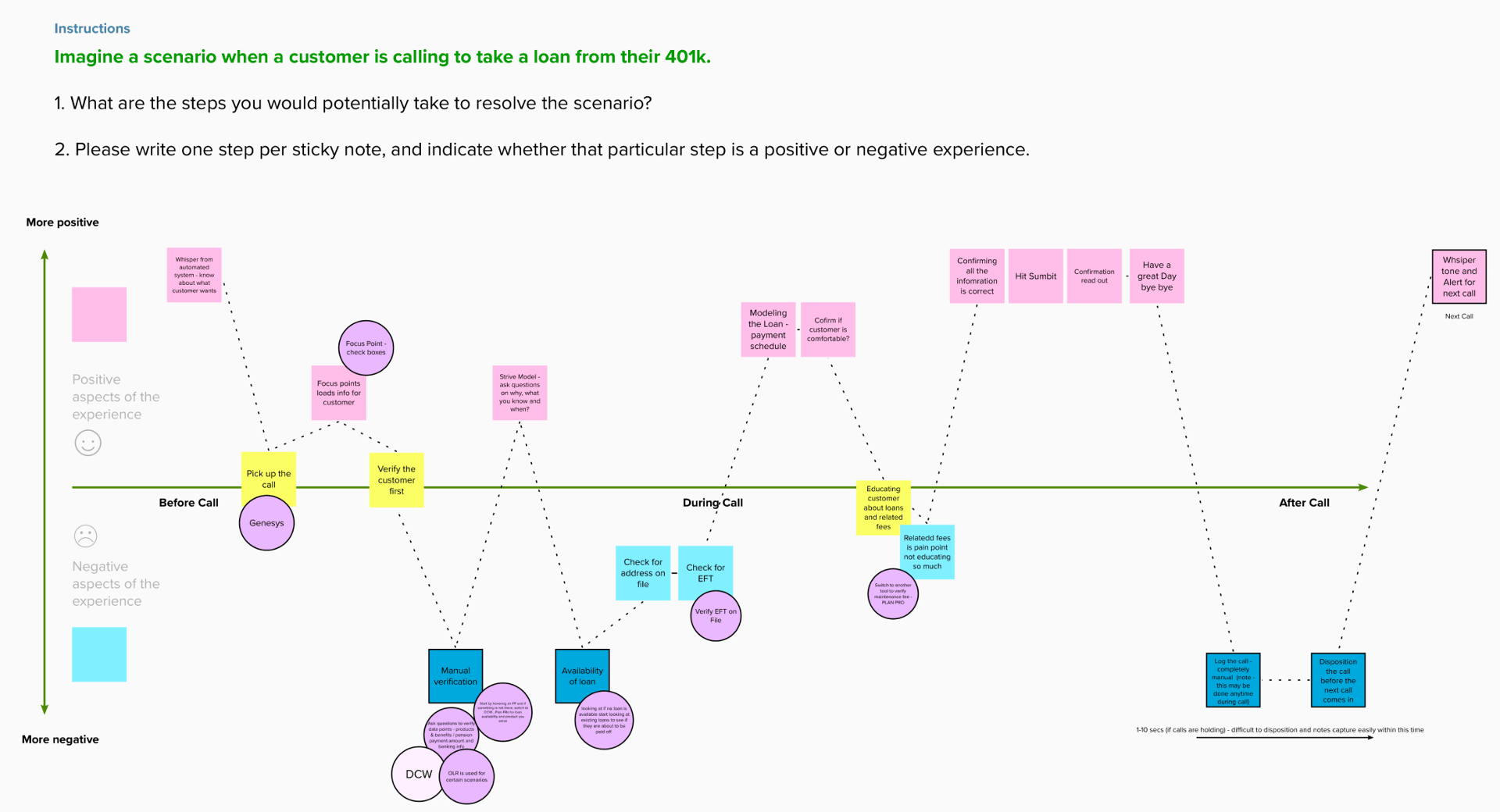 After several user sessions, we organized comments and sentiments into visual tools that helped us better understand the associate experience. We created experience diagrams that mapped actions before, during, and after a call, along with the positives and pain points at each stage. We also worked with stakeholders to build an empathy map capturing what associates say, think, feel, and do.
