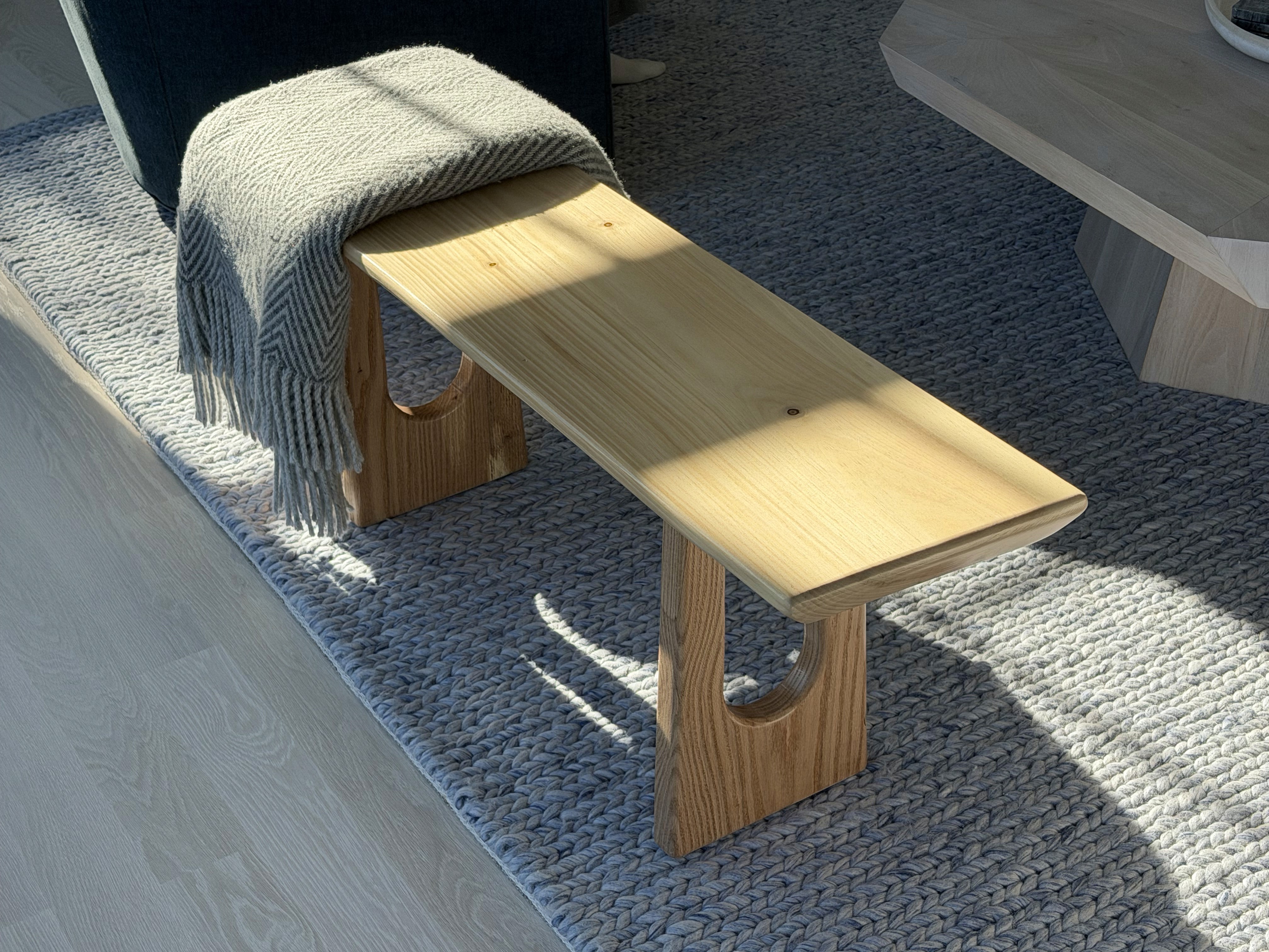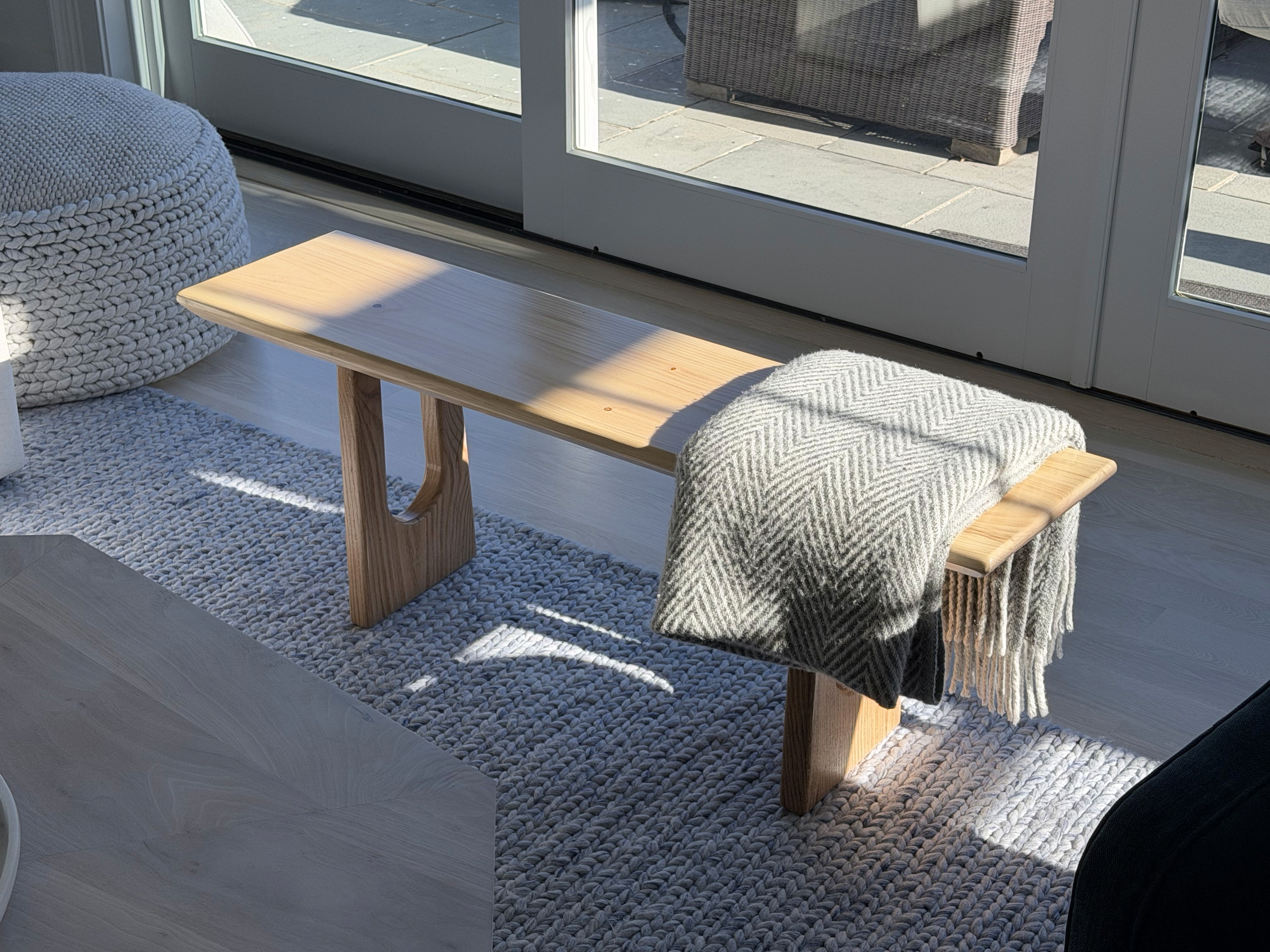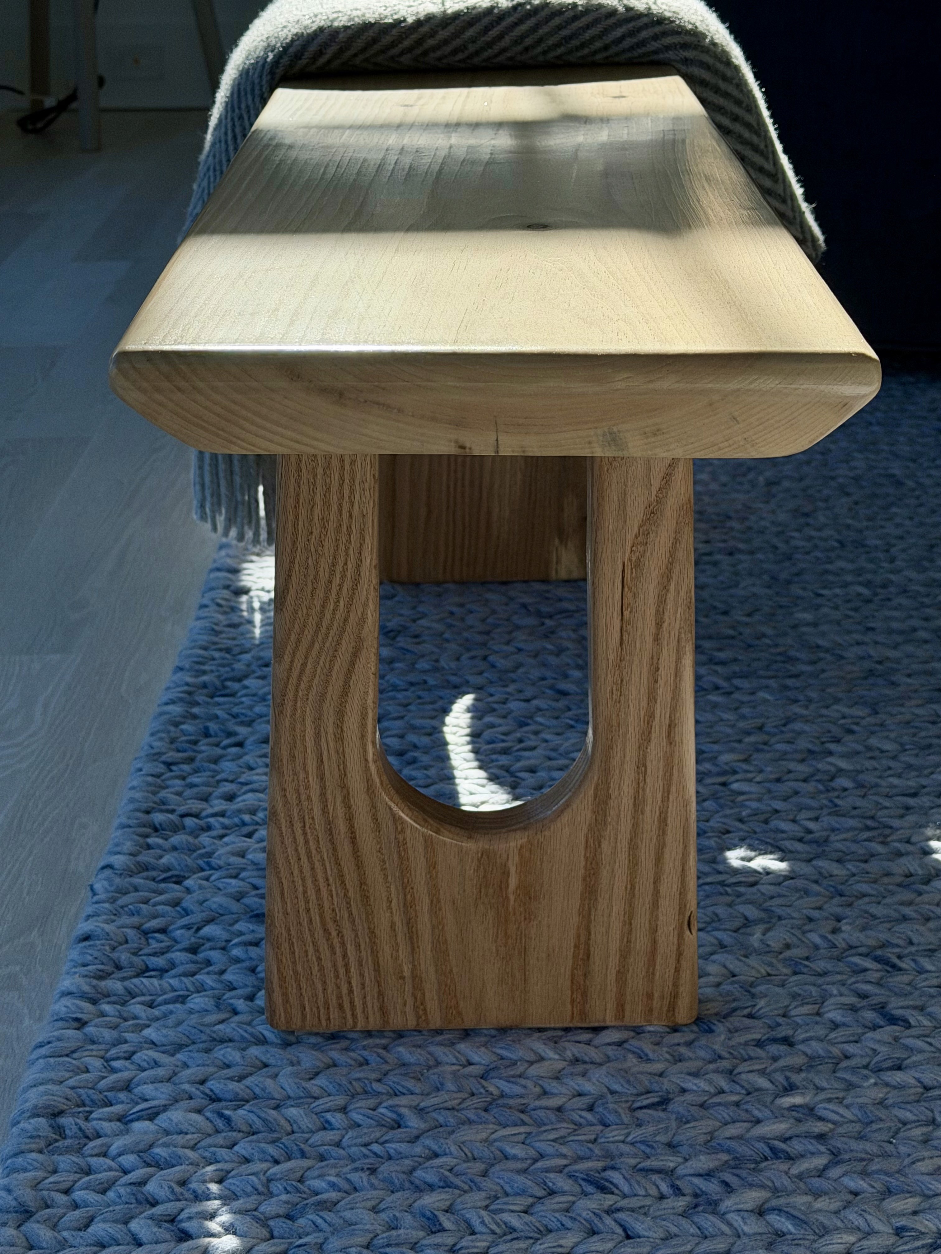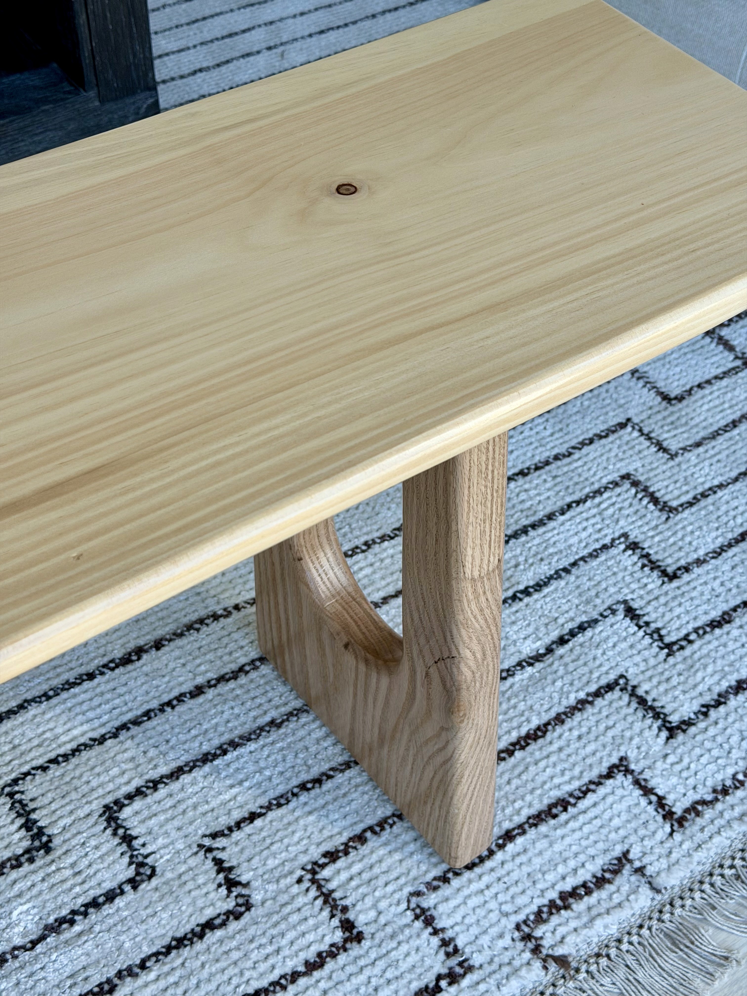 A simple bench made with a white pine top and oak legs. I rounded the legs to echo the slightly irregular, organic edges of the bench seat.