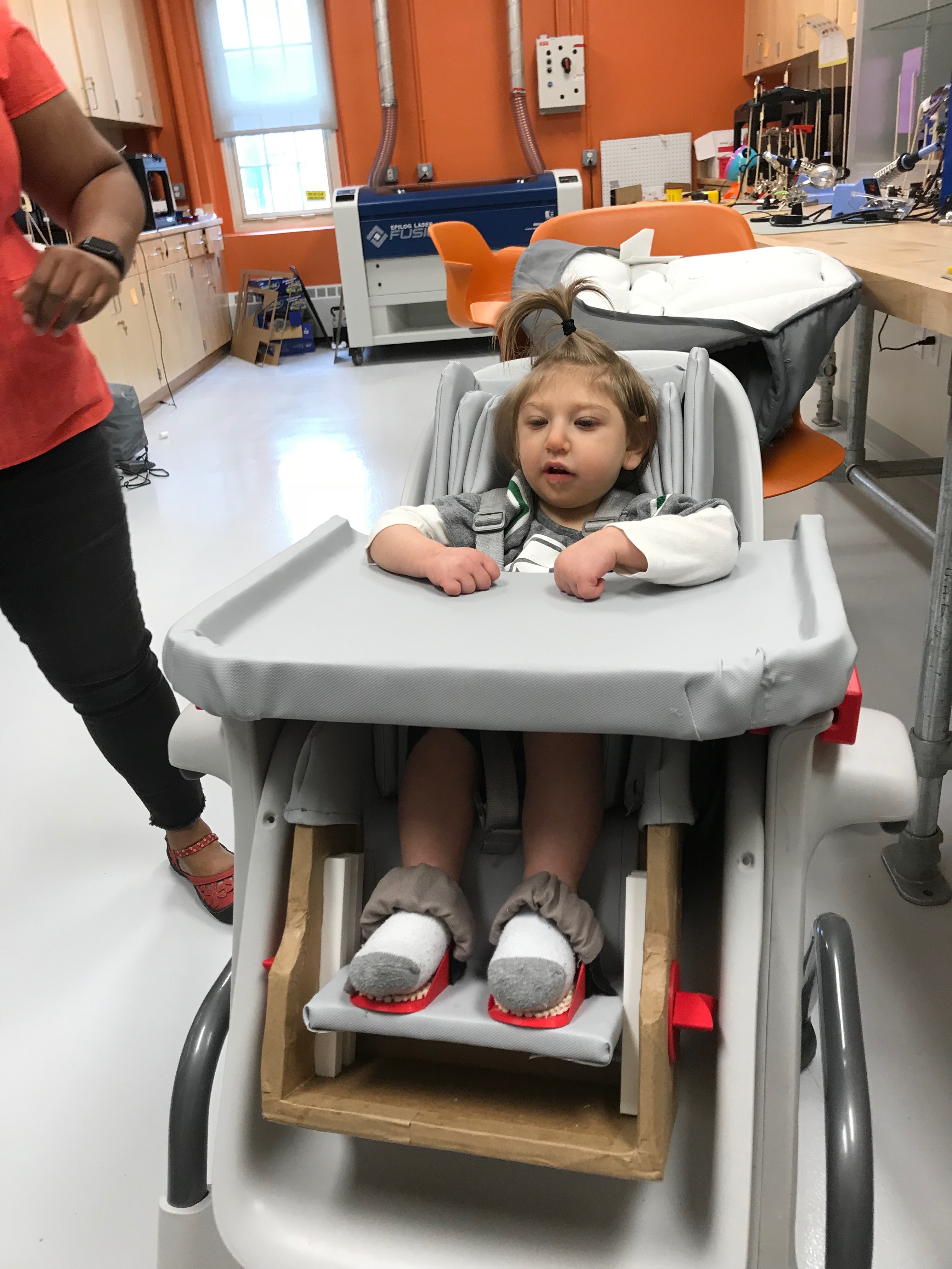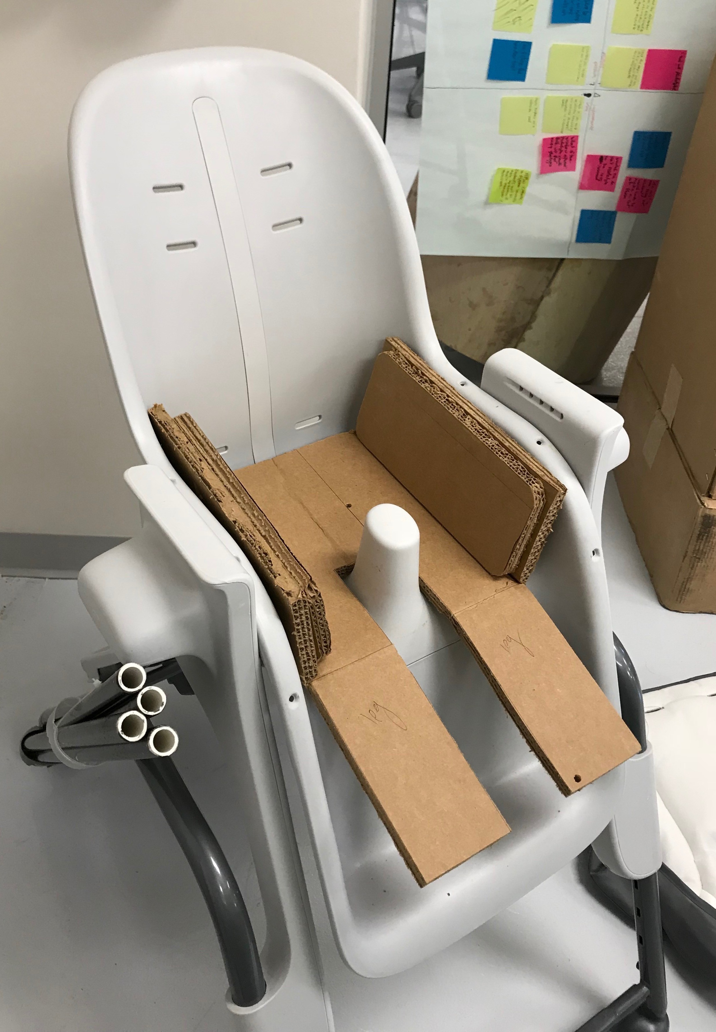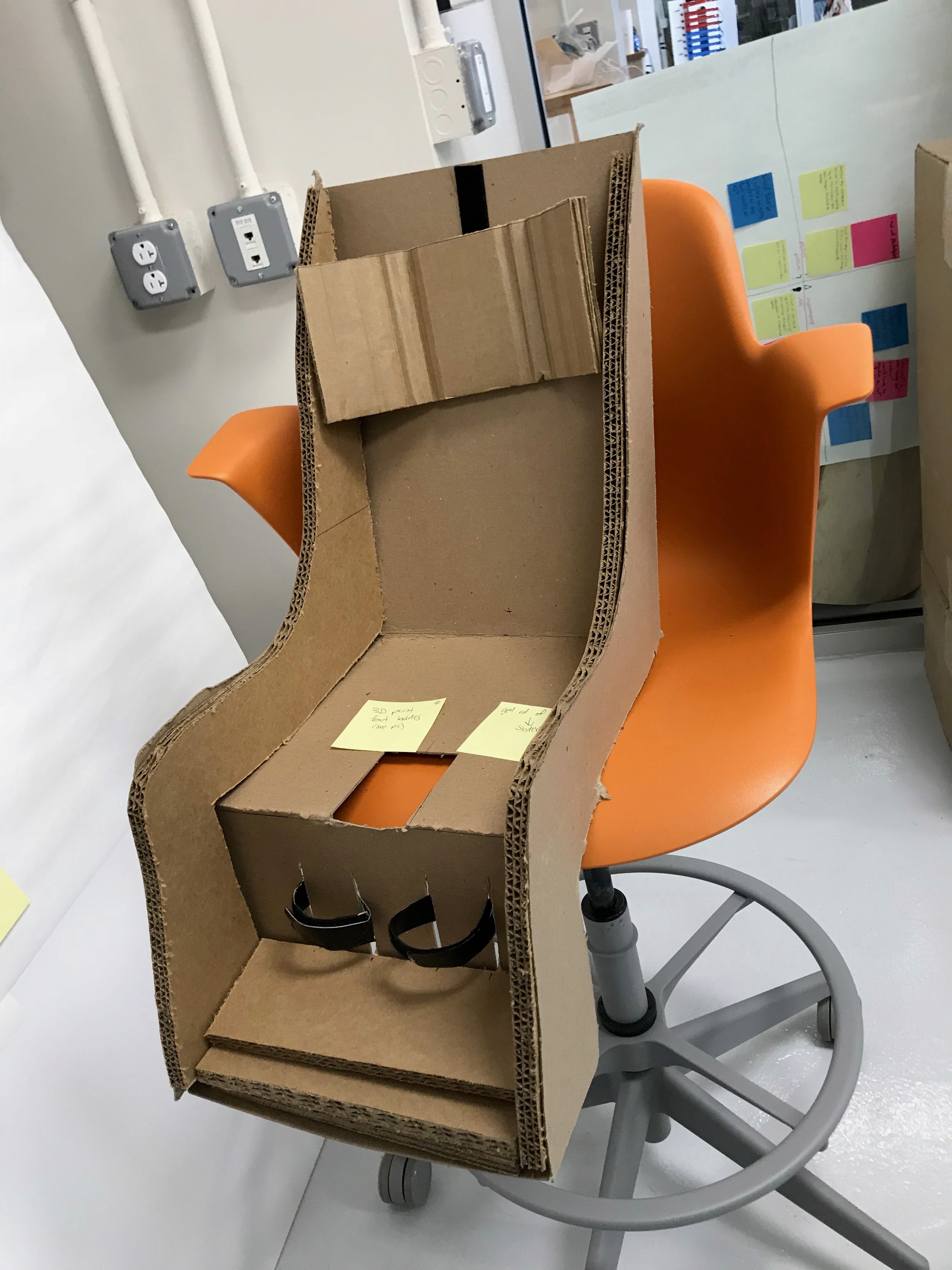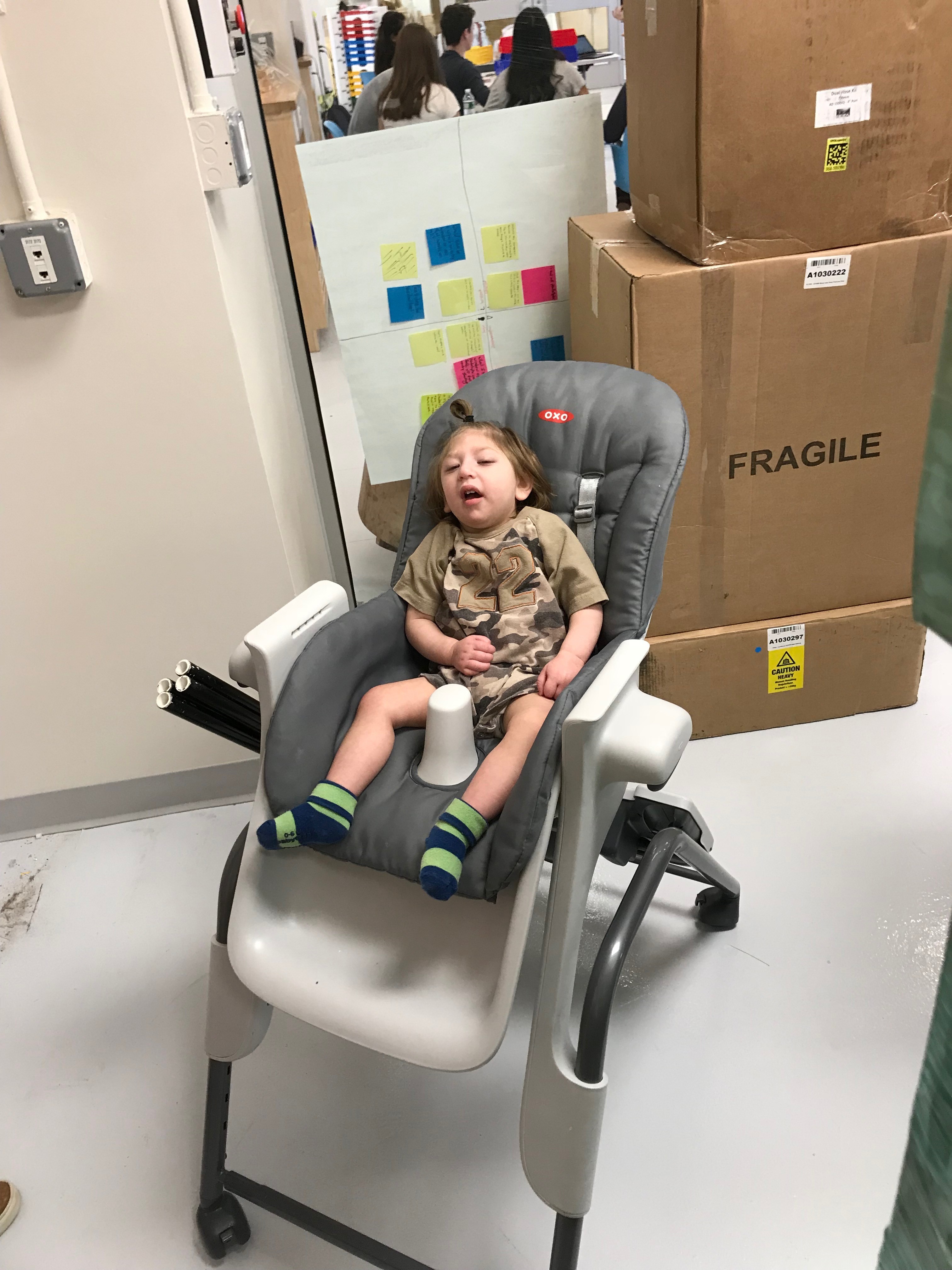 Yehuda has Microcephaly and Cortical Visual Impairment. As seen below in his original high chair, he is clearly too small for the chair, so he tends to slouch over and cannot keep his body upright. Over the course of this project, I went through four full-size prototypes (along with many smaller ones for various parts of the chair) as I met with the family every few days to offer my newest ideas and to gather the mother and therapists' feedback. I learned that the design process is not about designing a fancy product; it's about designing with and for the user to meet their needs.